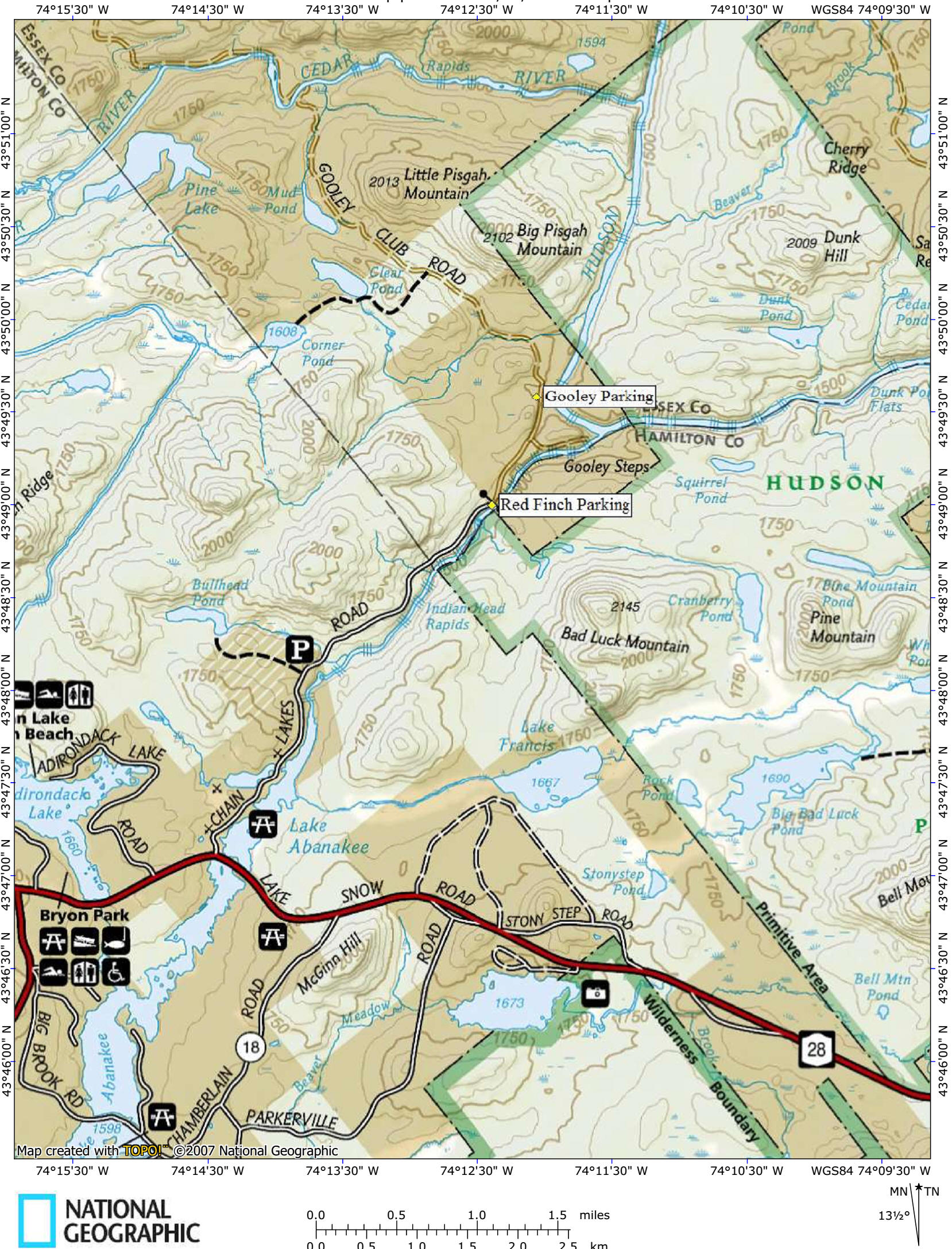 In 2014 the DEC created a second, larger parking area 0.8 miles further up the dirt road at the former site of the Gooley Club House. The GPS coordinates are N43 82.751 W74 20.081 for those with a GPS devise. There is a seasonal parking area further north along the road near the start of the Clear Pond Trail. It's only open during Big Game Hunting Season.