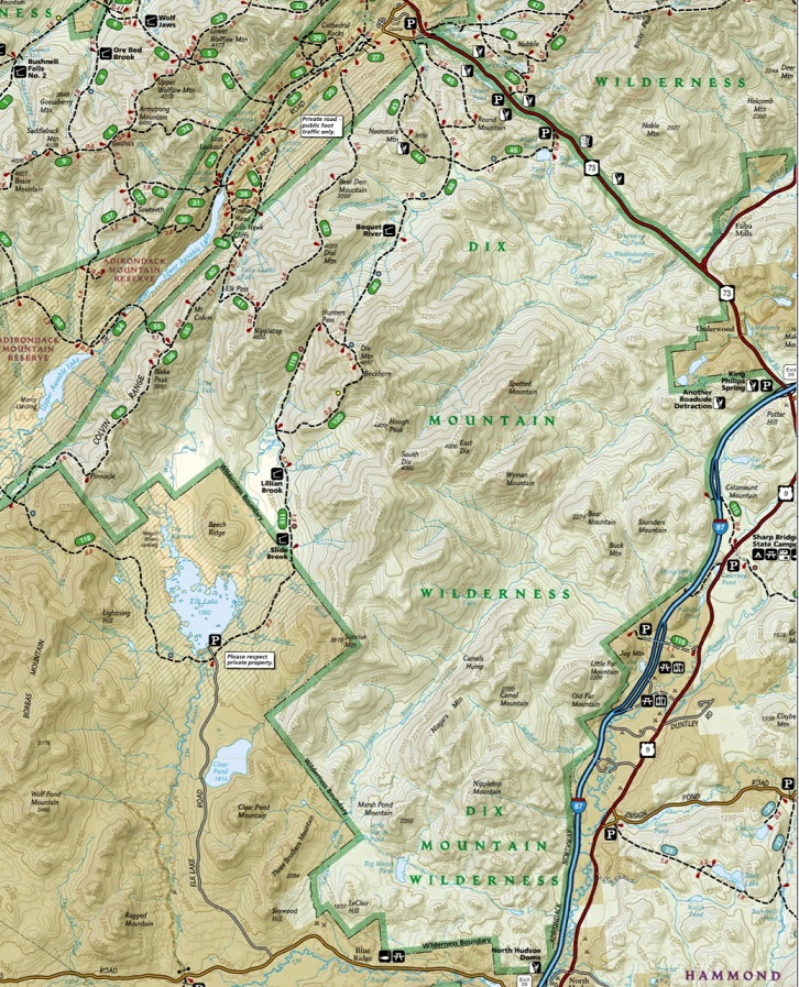 The 45,208 acre Dix Mountain Region is part of the High Peaks Wilderness (effective 2018) and is located in the east-central Adirondacks in Essex County. The Wilderness is bounded by NY 73 to the north, I-87 to the east, County Route 2 to the south, Elk Lake Preserve and Adirondack Mountain Reserve lands to the west. The main attraction is the 4857 foot Dix Mountain, although there are seven other peaks in this wilderness over 4000 feet. Dix Mountain is the sixth highest peak in New York State.