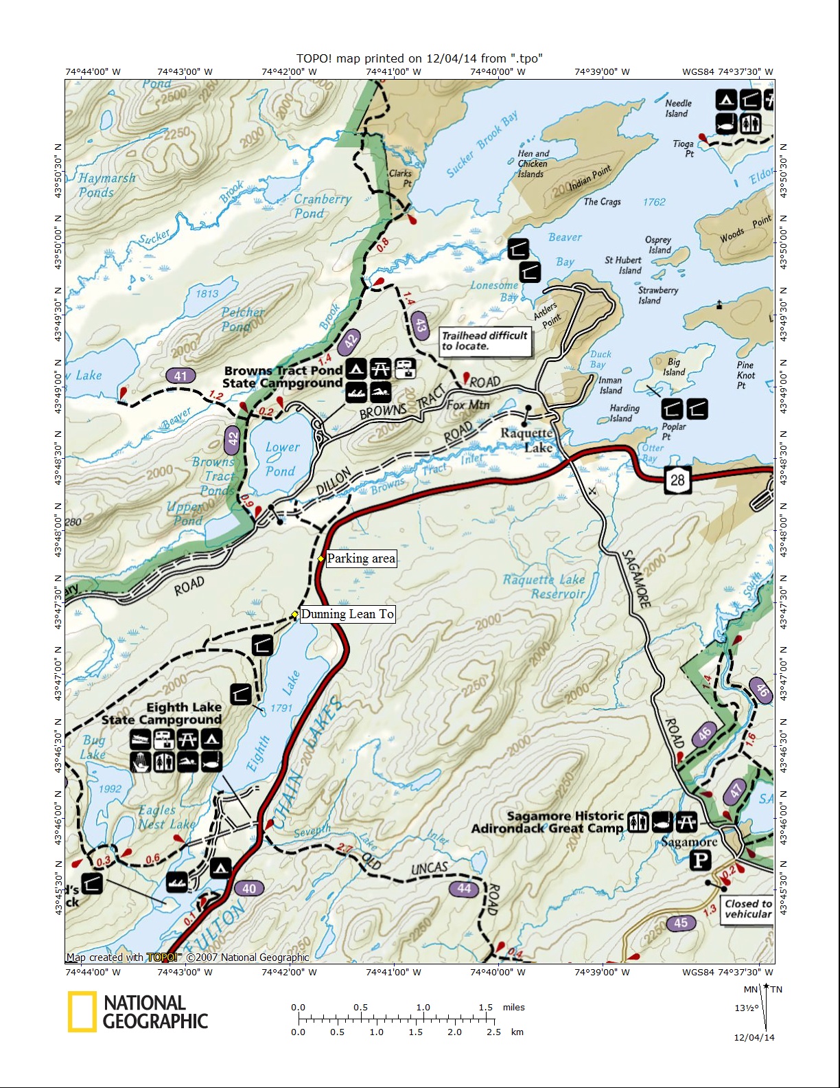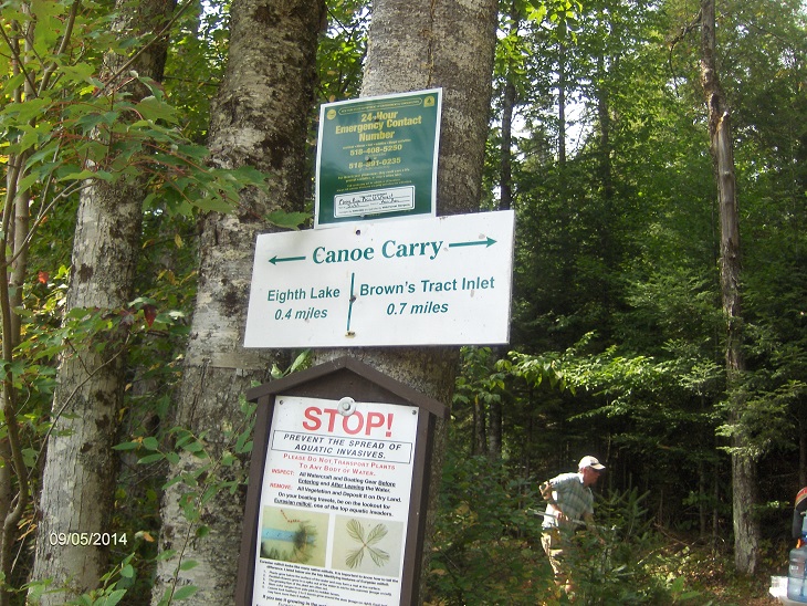 Most drivers normally pass right by the parking area located on NY 28 exactly 2.3 miles north from the Eighth Lake Campground and 2.3 miles south from the four corners in Raquette Lake. It has a small sign 'Canoe Carry' sign that is nearly impossible to see from the road. The GPS coordinates are N43 47.796 W74 41.706 for those who have a GPS devise in their vehicle.