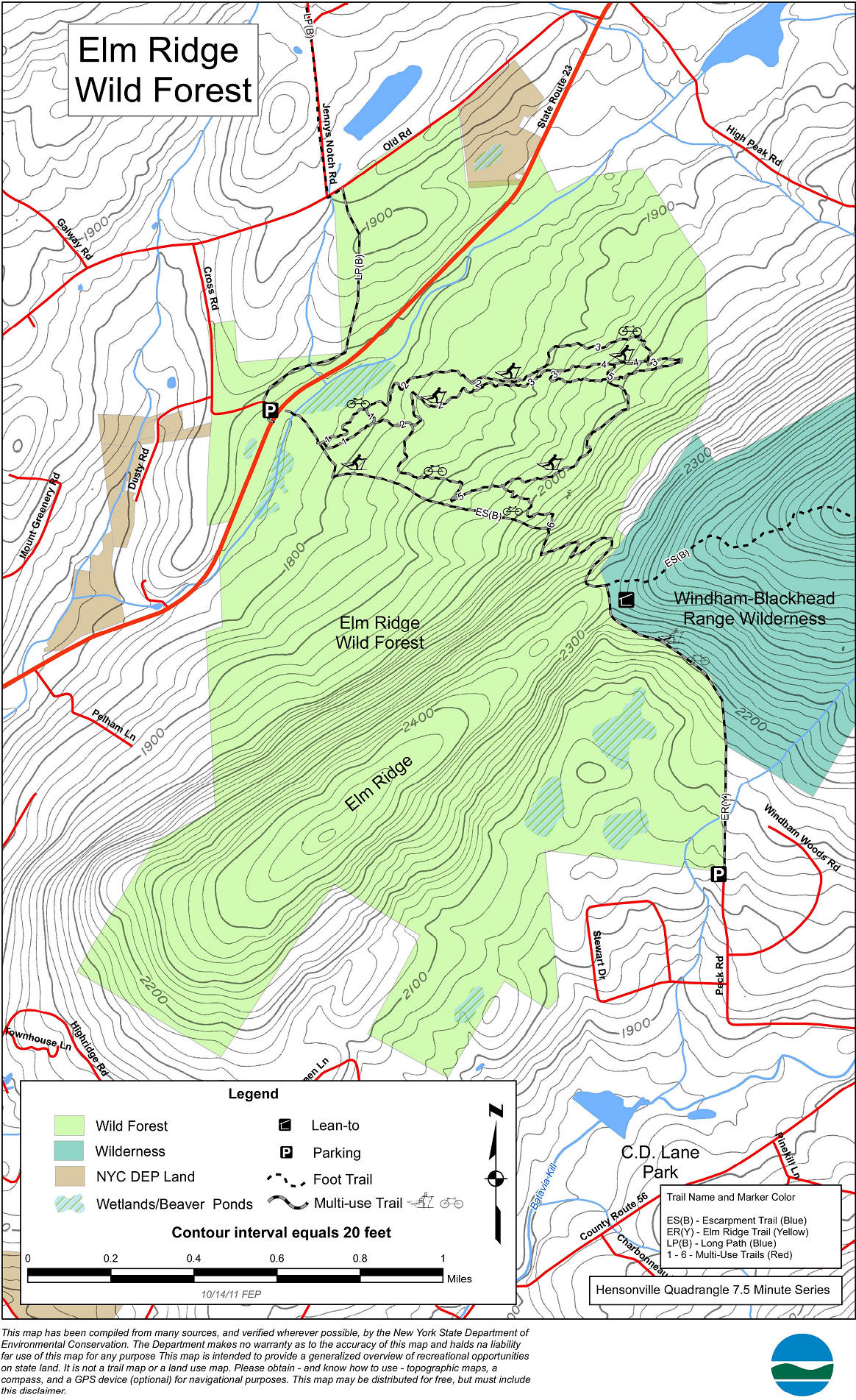 Located on the northern border of the Catskill Preserve is the 1355 acre Elm Ridge Wild Forest. The northern end of the overly popular Escarpment Trail is located in the wild forest and travels south over 20 miles to North-South Lake Campground. The Long Path coincides with the Escarpment Trail. A new four mile multi-use trail system was constructed in 2010 just to the north off the blue marked Escarpment Trail.