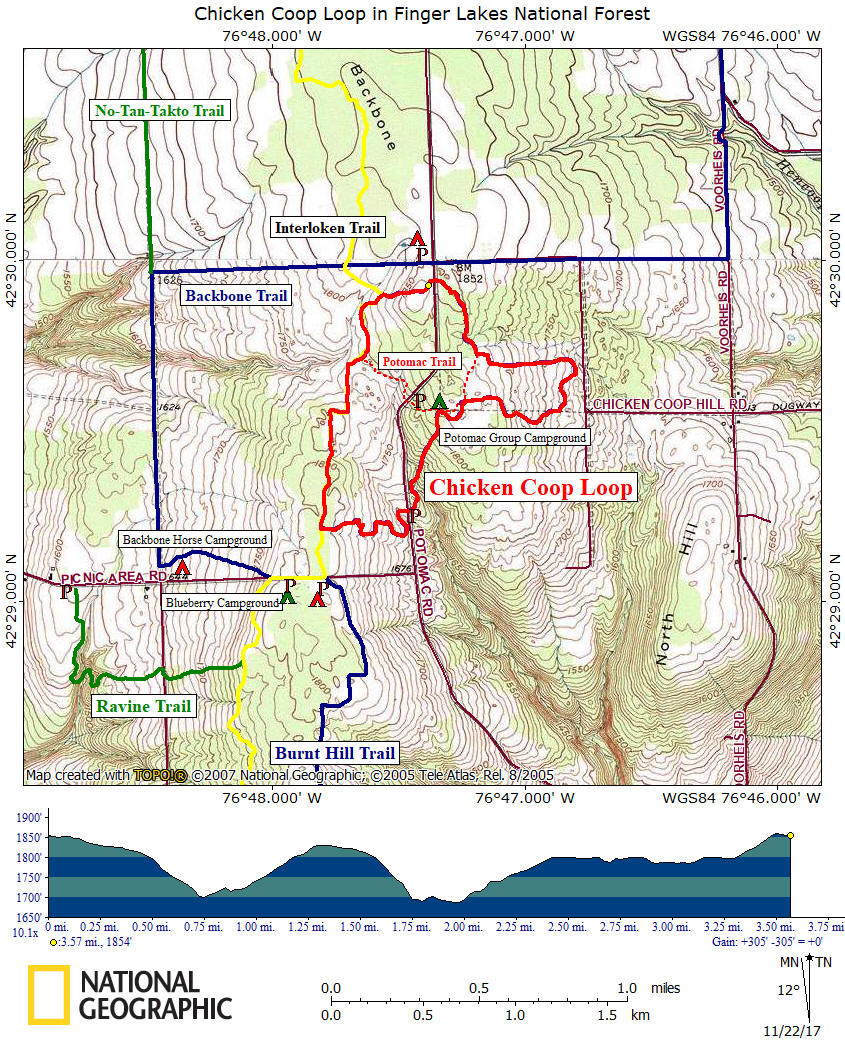 The Chicken Coop Loop is a 3.6 mile loop hike located in the Finger Lakes National Forest. This loop features 2.6 miles of the Chicken Coop Trail and one mile of the Interloken Trail. This loop hike features Foster Pond, Potomac Wildlife Pond, the Potomac Group Campground, and various types of forests. This area is a popular game bird hunting area, so be sure to know the hunting seasons. There is an overall elevation gain of 305 feet for this easy to moderate hike that most people in your family can enjoy.
