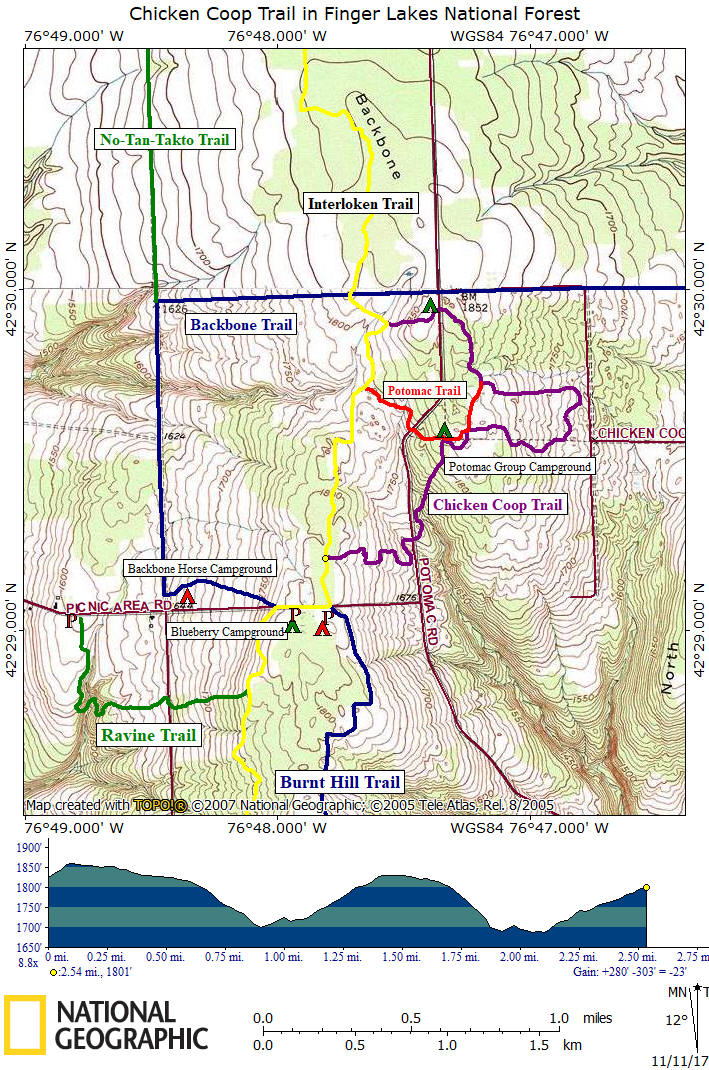 The Potomac Trail network includes the Potomac Trail. The Potomac Trail is 0.7 miles long. Both trails are relatively easy and can be enjoyed by everyone in your family. Most signs will say Potomac Trail, however locals call this trail the Chicken Coop Trail. There are no signs that say Chicken Coop Trail. The overall elevation gain for the Chicken Coop Trail is about 280 feet. We recommend doing the Chicken Coop Loop if you are looking for a nice, easy loop hike to do in the Finger Lakes National Forest. Look below for a map of this trail.