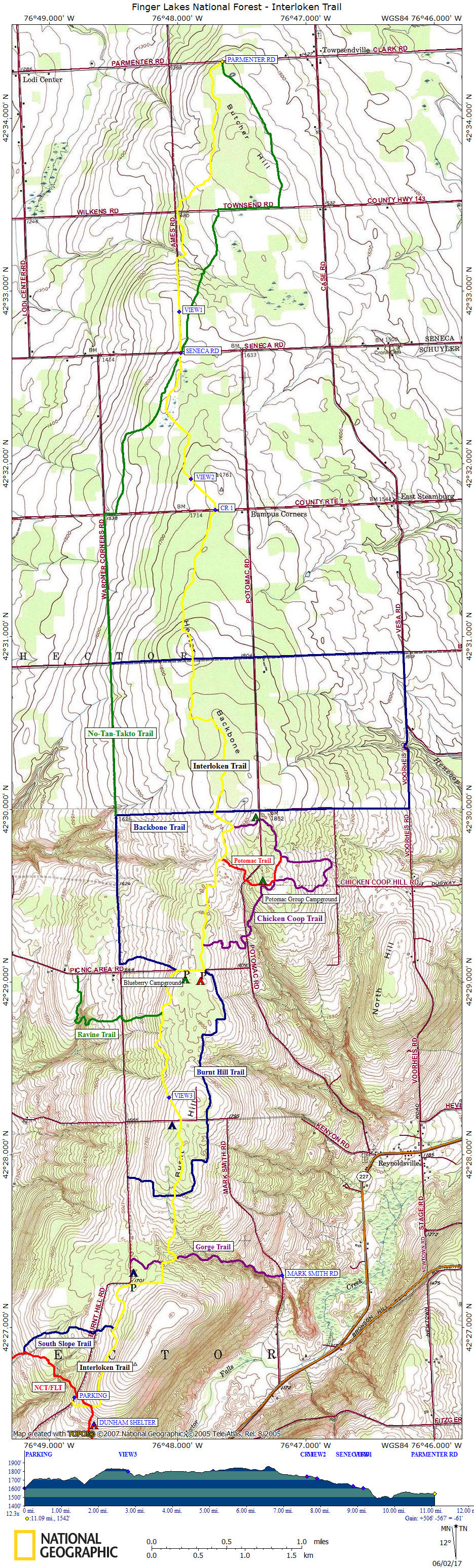The Interloken Trail is part of the 900+ mile Finger Lakes Trail System. It is a 11.1 mile trail located completely in the Finger Lakes National Forest. The FLNF is located just northeast of Watkins Glen off the east shore of Seneca Lake. It is in Seneca and Schuyler Counties. This is the longest of the hiking trails in Finger Lakes National Forest as well as the most popular. The trail is blazed orange. There is an overall elevation gain of just over 500 feet for this trail.