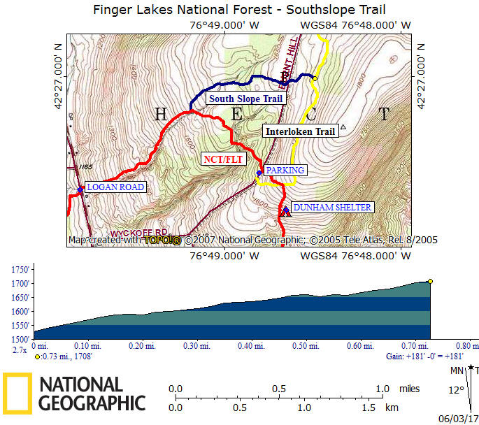 The Southslope Trail is located at the southern end of the National Forest. The trail passes through hardwood as well as conifer stands and crosses a small stream (dry at times). It is a short 0.75 mile, easy trail that intersects the Interloken Trail, which is a portion of the Finger Lakes Trail System as well as the main Finger Lakes Trail, which coincides with the North Country National Scenic Trail. The trail crosses Burnt Hill Road, where there is a small parking area for 3-4 cars.