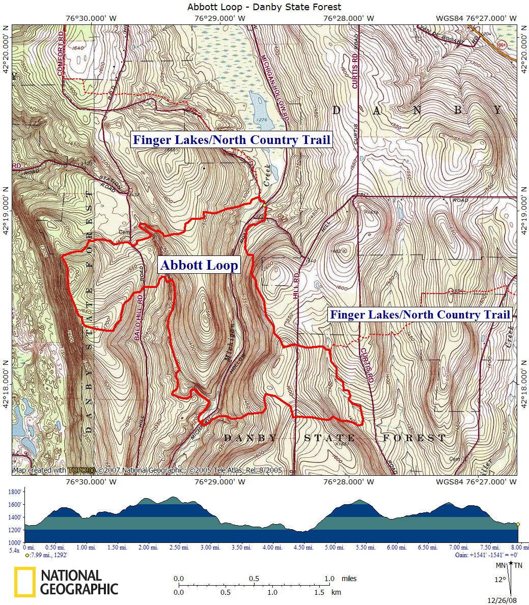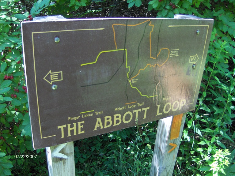 The Abbott Loop is a well marked, easy to follow, rugged eight mile loop hike in Danby State Forest. This loop utilizes the Abbott Loop Trail (orange blazes) and the Finger Lakes Trail / North Country Trail (white blazes). This is one of the most popular loop hikes in Central New York. This loop hike features the scenic views from an overlook called Thachers Pinnacles.