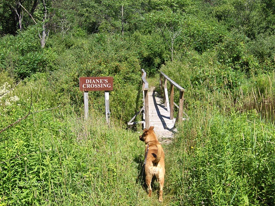 0.05 1271 ft "Diane's Crossing". Cross footbridge over Michigan Creek and then turn left on to orange blazed Abbott Loop Trail. Follow the orange blazes.