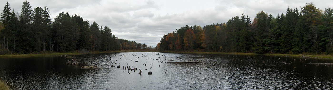 A blue blazed trail soon appears on your right that leads to Wiley Pond (see panorama above) and a camping area. The FLT then skirts near Mud Pond before leaving the state forest briefly to cross private property before crossing back into the state forest. In another 0.5 mile the trail will leave Wiley Brook State Forest for the final time, soon following near a streambed and then an access road to Cooper School House Road.