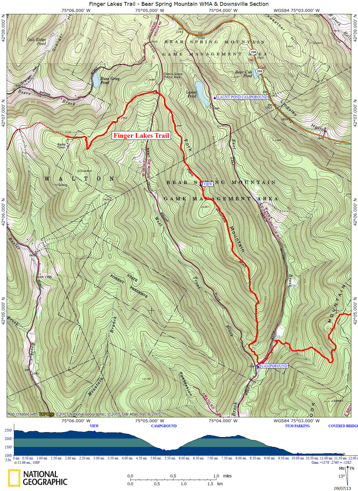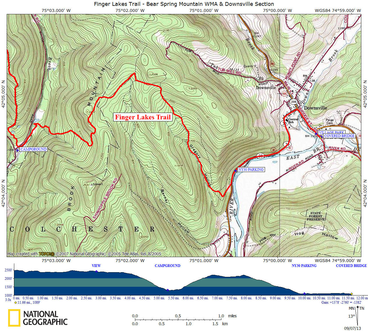 0.4 2354 feet Turn left on Blue Horse Trail #7. 1.6 2359 feet Turn right and soon after cross seasonal dirt West Trout Road. Good parking. Trail register. Following Blue Horse Trail #5. 2.0 2481 feet A summit of Fork Mountain. 2.8 2414 feet A view to your right. 4.0 2279 feet Junction with Blue Horse Trail #4 on left. Continue straight. Continue long descent. 5.0 1479 feet Trail junction. Turn left. 5.3 1332 feet Register. Large DEC parking area. Cross road and enter campground, pass site #28 then left on Blue Trail #8. 5.6 1316 feet Here you'll ford East Trout Brook. We suggest walking along road and cross bridge over brook. 5.7 1336 feet Turn right on Blue Horse Trail #12. Ascending. 7.7 2145 feet Turn right onto woods trail that will soon become an old woods road. You are on private property. White blazes! 9.9 1095 feet Reach NY 30 and turn left, following the road. 10.0 1098 feet Some parking on right near transfer station. 11.2 1119 feet Turn right on Main Street. You are in the heart of Downsville. Soon pass Post Office on right. 11.5 1099 feet Turn right on Bridge Street. 11.6 1097 feet Village park on right with good parking. Downsville Covered Bridge over East Branch Delaware River is ahead. Once you cross the bridge you will be entering the Catskills. For a continuation of the Finger Lakes Trail see the Campbell Mountain section.