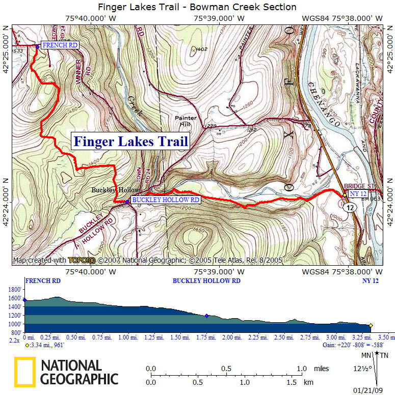 This short 3.4 mile section of the Finger Lakes Trail begins off of French Road and ends at the FLT crossing of NY 12 near the Chenango River. This section is located in Chenango County, southwest of Oxford, NY and is a very scenic section of the Finger Lakes Trail. This stretch of the FLT is featured on map M25 from the FLTC.