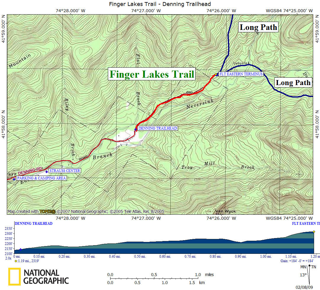 1.2 2319 feet Reach the eastern terminus of the Finger Lakes Trail at the junction of the Long Path.