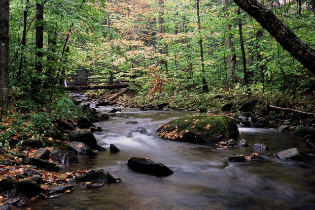 You are in the upper sections of the Beaverkill River, a few miles from its source between Graham and Doubletop Mountains. There are a few camping spots along this section of trail. The trail will cross the river on stones, then at an open meadow with a nice view of Graham Mountain the trail turns right.