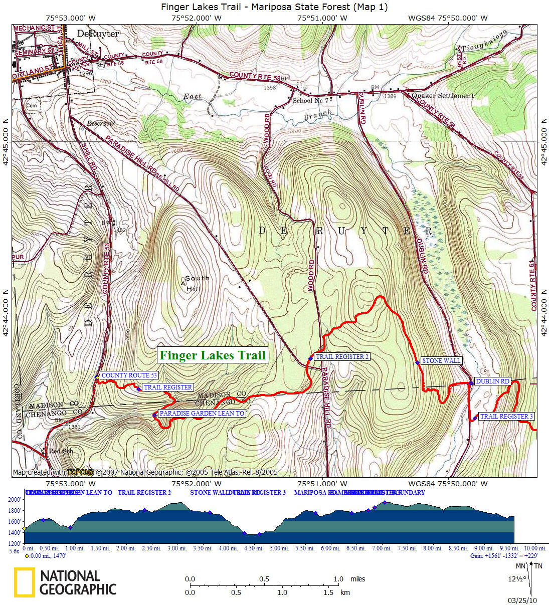 Mile Elevation Description (west to east) 0.0 1470 ft Madison County Route 53 Trailhead (Linklaen Street). Ascend old woods road. GPS N42 43.623 W75 52.795
