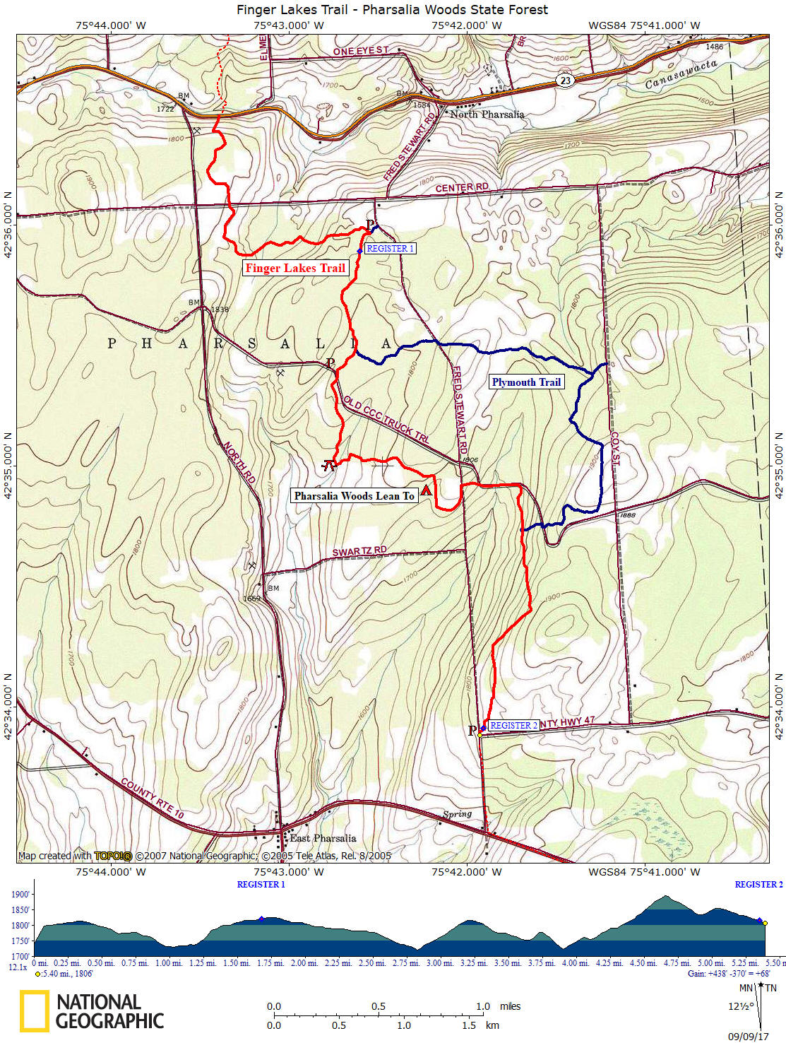 Mile Elevation Finger Lakes Trail Description (North to South) Following white blazes 0.0 1738 feet Trail crosses busy NY 23. Possible shoulder parking. GPS N42 36.458 W75 43.390