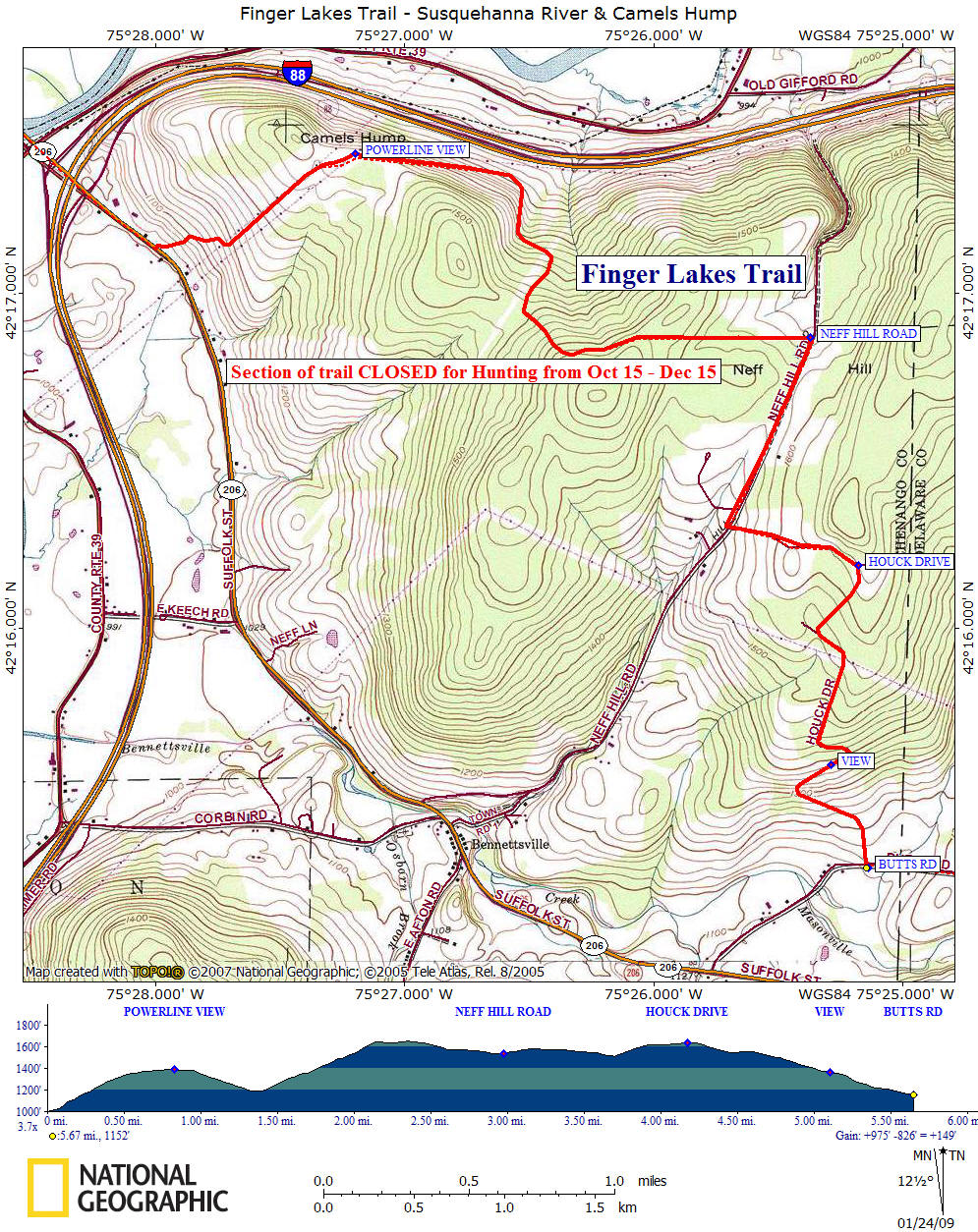 Mile Elevation Trail Description (follow white blazes) 0.0 1003 feet Trail turns left off NY 206 about 0.25 mile past the I-88 interchange. Ascend up Camels Hump by following left side of hedgerow. From here to Neff Hill Road the trail is CLOSED for hunting from Oct 15 - Dec 15.