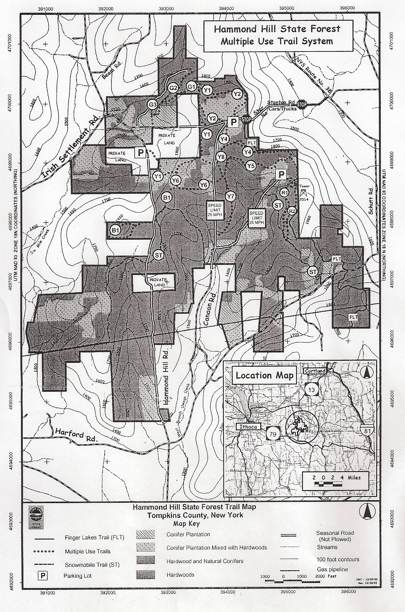The trails are marked with circular trail signs. All trails are designated by color and number. Most of the trails are above 1800 feet in elevation; therefore, these trails are well suited for cross-county skiing. Trailed parking is provided in a parking lot on Cayuga Nature Center property on Hammond Hill Road. The trails are classified by the user's ability. Beginner trails have very gentle slopes and are fairly short in length. Intermediate trails have gentle to somewhat steep slopes and are moderate in length. Advanced trails have gentle to steep slopes and are usually longer in length than intermediate trails.