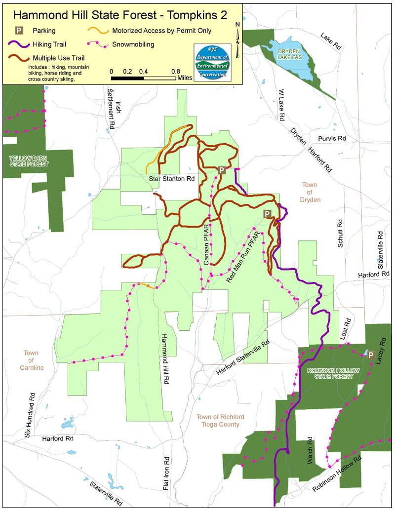 The 3618 acre Hammond Hill State Forest is located in the towns of Caroline and Dryden in eastern Tompkins County. It is a very popular location for hiking as well as biking and has over 16 miles of an extensive trail system. The Finger Lakes Trail / North Country Trail also travels through the forest. Hammond Hill State Forest is a popular area for outdoor recreation. Present activities include: hunting, hiking, fishing, bird watching, camping, cross-county skiing, mountain biking, horseback riding, trapping and snowshoeing.