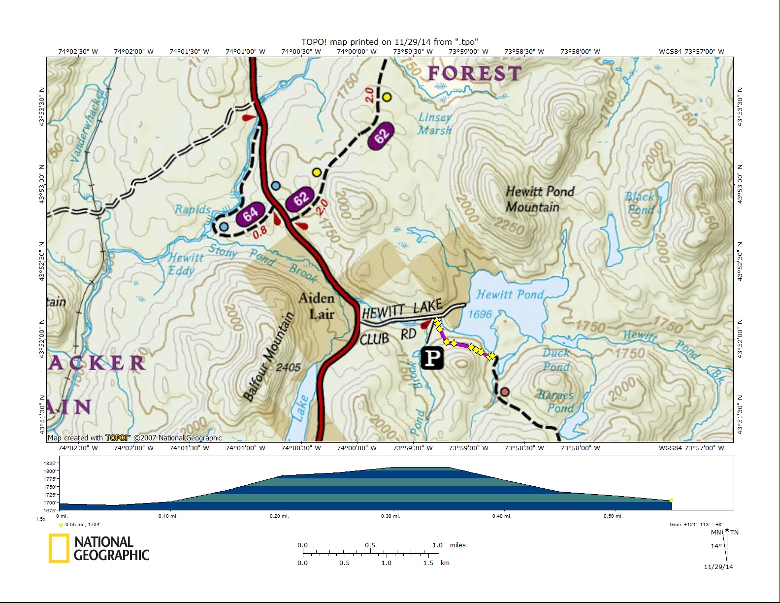 Directions: Take NY 28N out of North Creek toward Minerva. Hewitt Lake Road is 7.1 miles north of Minerva. Drive the dirt road for 0.5 miles to a large parking area on the right. The dirt road is well maintained and can be driven by all vehicles. The GPS coordinates are N43 52.158 W73 59.317 for those who have a GPS devise in their vehicle.