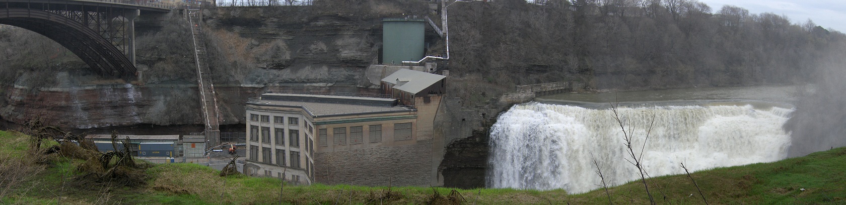 From the parking area, walk past the rest room building and past the Genesee Riverway Trail kiosk. Take the trail that leads into the gorge and soon you'll be walking toward (under) the Driving Park Ave bridge. You might notice the remains of old buildings on the left between the trail and river gorge. Soon the trail goes under the big bridge as the sound of the falls get louder. At 0.2 miles you arrive at the first overlook (panorama above). Continue on, keeping left at each trail junction and arrive at the best view of Lower Falls at 0.3 miles near a sculpture.