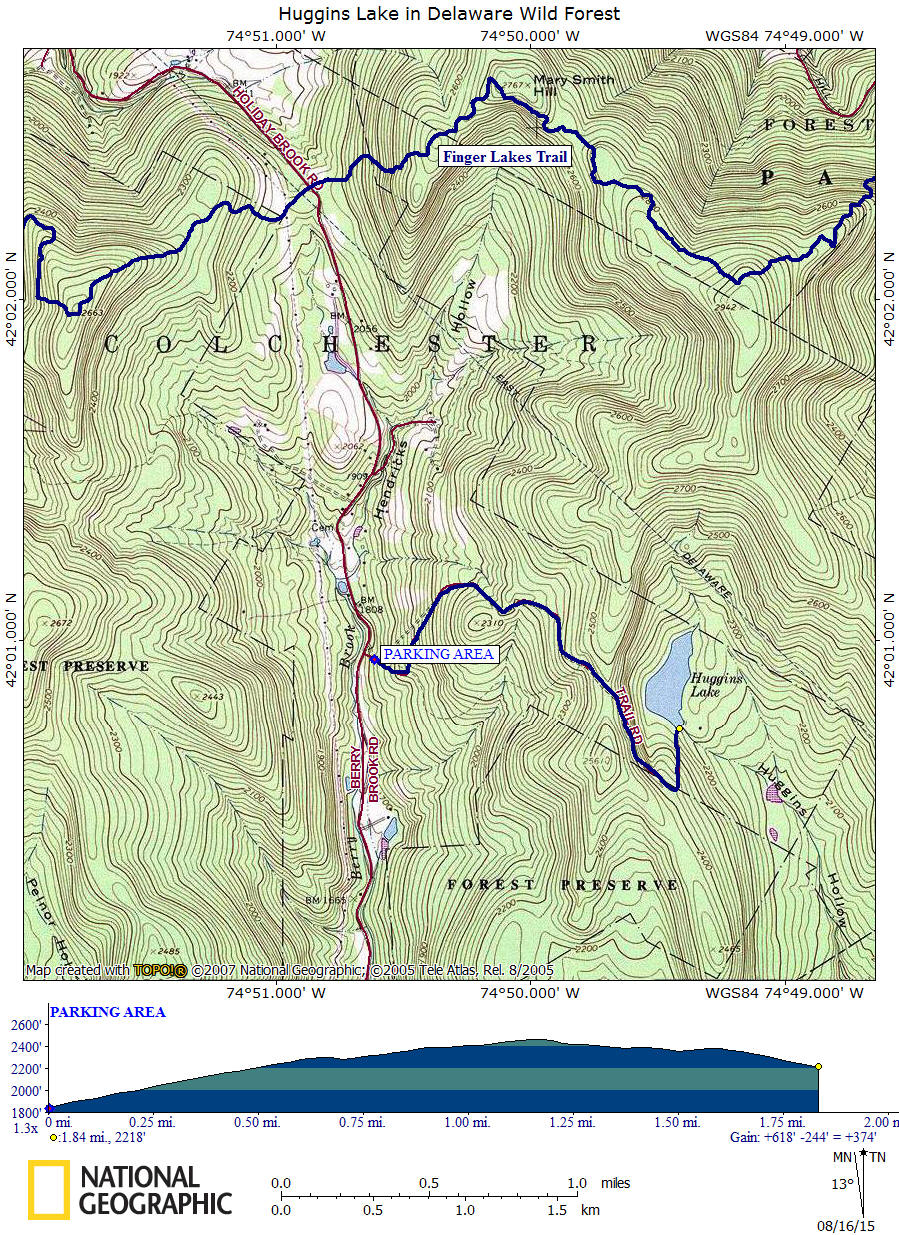 Huggins Lake is located in the Delaware Wild Forest of the western area of Catskill Park. An old dirt road takes hikers 1.8 miles from the small parking area to a pretty little lake. There are primitive campsites located near the shores of the lake. Guide books state that this path is not maintained. The old road looked to be in good shape when we visited in the summer of 2015, with only one deadfall blocking the road.
