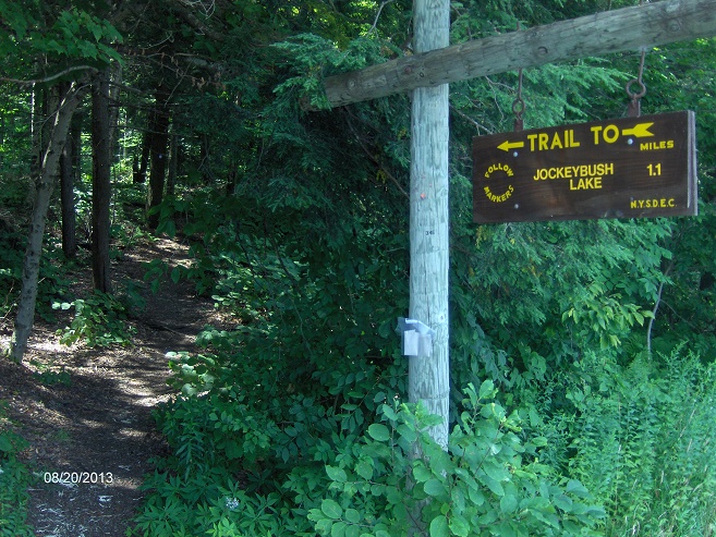 This great short hike features views of the stream the trail follows, a few small waterfalls and at the end of the trail, Jockeybush Lake. The trail to the lake is easy to walk except for a few muddy stretches and you may want to avoid the the trail in the spring due to the stream crossing. The trail begins at the parking area on the west side of NY 10. The GPS coordinates are N43 18.061 W74 33.963 for those who have a GPS device in their car. There is a snowmobile trail that also leaves the parking area that might confuse some hikers. The Jockeybush Lake Trail is well marked with signs and DEC plastic markers.