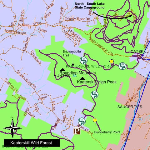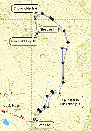 The northern approach has a side trip off the Long Trail called Poet's Ledge, which drops down to some fine views, so perhaps it's best to see it on the way out. The southern approach also has a side trip off the Long Path called Huckleberry Point, which is a popular destination by itself. There is a viewpoint not far from the summit of Kaaterskill High Peak as well, called Hurricane Ledge. The summit of Kaaterskill High Peak has no views, and is in a grassy clearing, but it does have a USGS marker, which is a rarity for Catskill mountains.Summary: Catch the blue blazed Long Path (also marked by the DEC as a snowmobile trail). The walk starts out as a gentle climb through a mixed hardwood forest with occasional stands of hemlock, eventually passing east of the summit. Parts can be very wet in all but the driest of years. The trail then wraps around the north side of the summit. Keep your eyes out here for the spot where the Long Path leaves the snowmobile trail. Turn left on the snowmobile trail and left at a 'T' intersection. The trail is very muddy in spots. Keep your eye out for a plane crash site on your left. As this trail swings around the south side of the mountain, look for an unblazed trail to your right (a cairn marks the spot). Here the climb is a steep one, requiring all fours at some points. A ledge with superb views will be reached soon. Continue over the summit and down the north face. Bear right on the snowmobile trail, left at the 'T' and return via the Long Path.