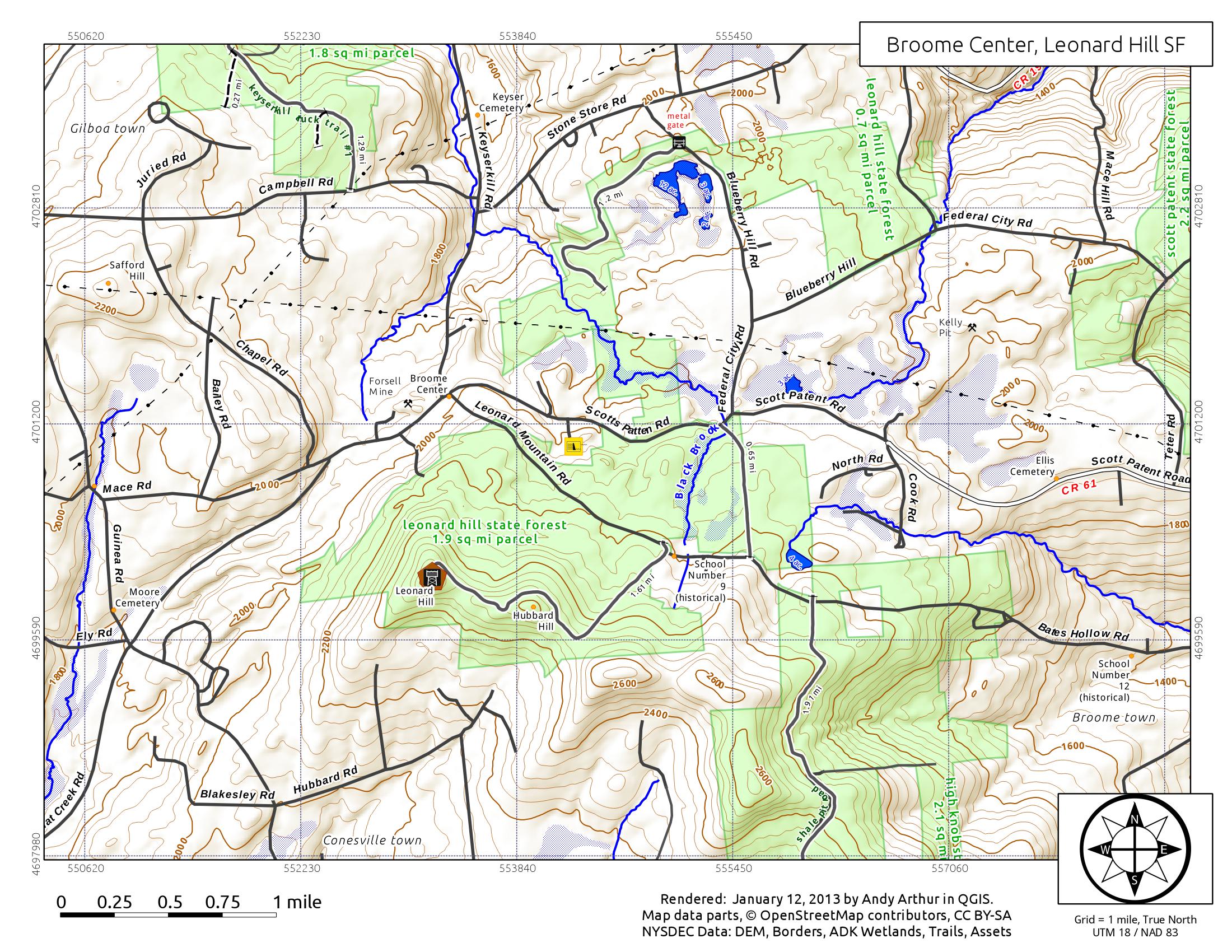 The 1617 acre Leonard Hill State Forest is located near Broome Center in southeastern Schoharie County. The main feature is an old fire tower that still stands on the summit of the 2605 foot Leonard Hill. The bottom steps of the fire tower have been removed, so there is no way to climb the tower. A 1.6 mile truck trail leads to a overlook and the fire tower. The view includes the Blenheim-Gilboa Reservoir and Utsayantha Mountain in the distance. There are a couple of primitive campsites located near the fire tower.