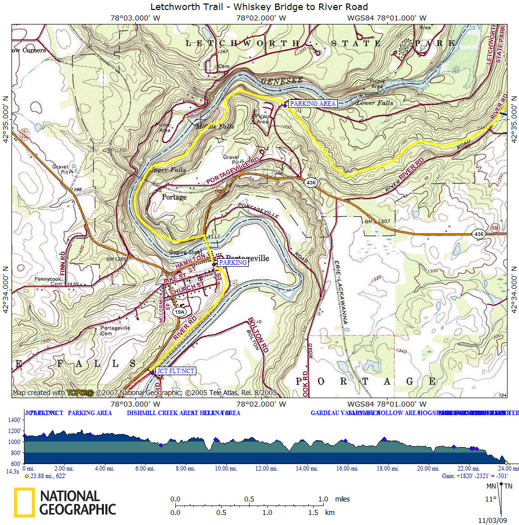 Mile Elevation Letchworth Trail (Trail #7) Description (South to North) Yellow Blazes 0.0 1110 ft Southern Terminus of Letchworth Trail at the FLT/NCT junction near Whiskey Bridge. Parking. Follow yellow blazes north. Following old railroad bed. Trail coincides with Genesee Valley Greenway.