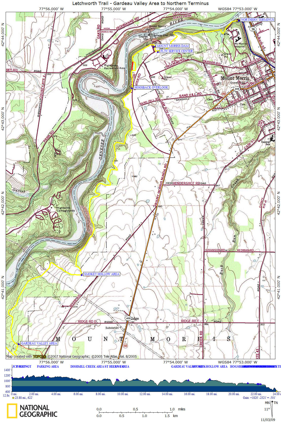 22.0 885 ft Cross under power lines. Views. Trail soon enters Mt Morris Dam Parking Area.