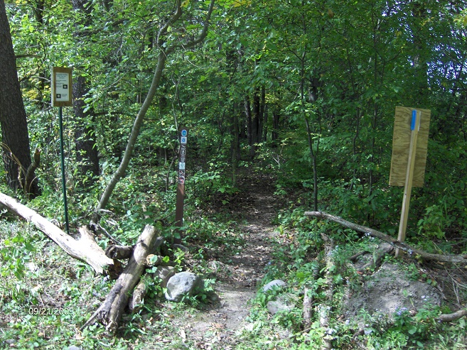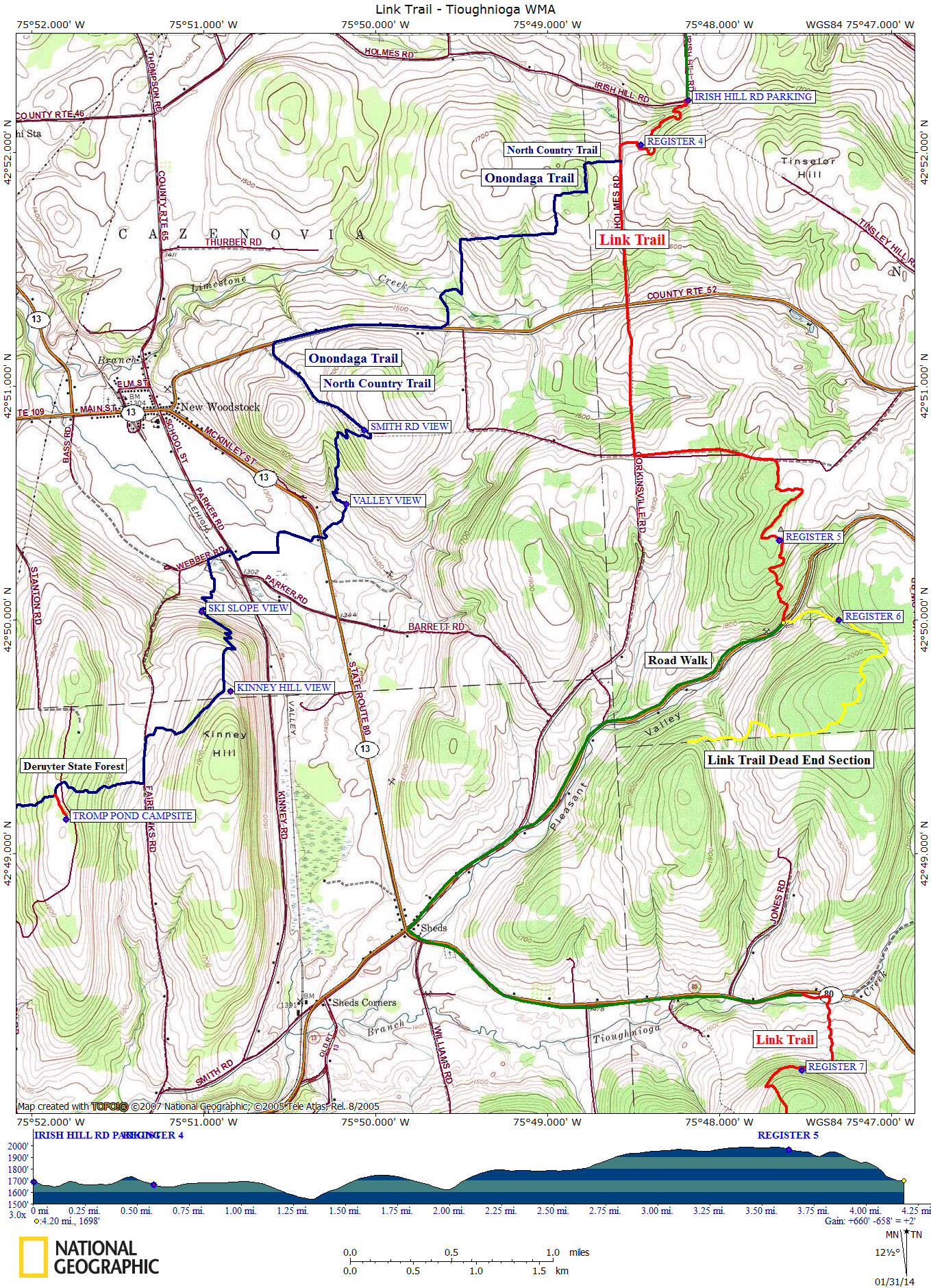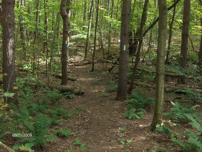 0.8 1672 feet Junction of blue blazed Onondaga Trail on your right. The North Country Trail now follows the Onondaga Trail. Link Trail continues straight following just yellow blazes.