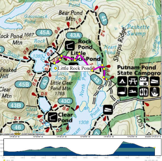 Rock Pond is a just 0.1 miles continuing on the yellow marked trail. At the next trail junction, turn right and you'll soon reach Rock Pond Lean To as well as the larger Rock Pond. To return, simply retrace your steps back to the campground. There are many hiking opportunities for those looking for more of an adventure. There is a trail that goes around Rock Pond. Check out Rock Pond for more information. Look below for a map, video and some pictures. You can get more info on hiking in this area with trail maps of the Adirondacks from Adirondack Park Bundle- Trails Illustrated Map
