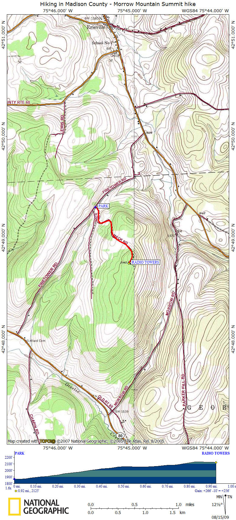 The forest is located north of NY 80 and is easily assessed from Fire Tower, Parker Hill, Morrow and Mollie Roads. The start of the Morrow Mountain Summit Hike is located at the DEC sign off Fire Tower Road. Park here and simply ascend the truck trail 0.9 miles to the summit. The GPS coordinates of the start of the truck trail aka Forest Road is N42 49.302 W75 45.497 for those who have a GPS devise. There is only a 266 foot elevation change, so this is a pleasantly easy to moderate hike.