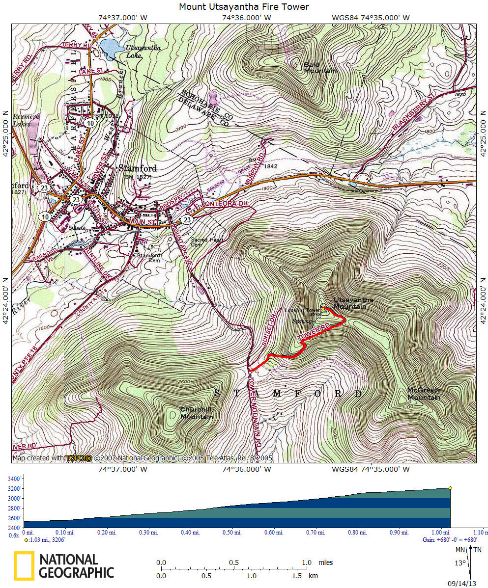 Located just outside of the Catskill Forest Preserve is the 3214 foot Mount Utsayantha and it's popular fire tower. It is located just southeast of the village of Stamford in Delaware County. This mountain is a village park and you can either hike or drive the one mile gravel road to the summit. There is a 680 foot elevation gain for the one mile road. On the summit is the restored fire tower, numerous radio towers, picnic tables, a summit building and a porta-potty.