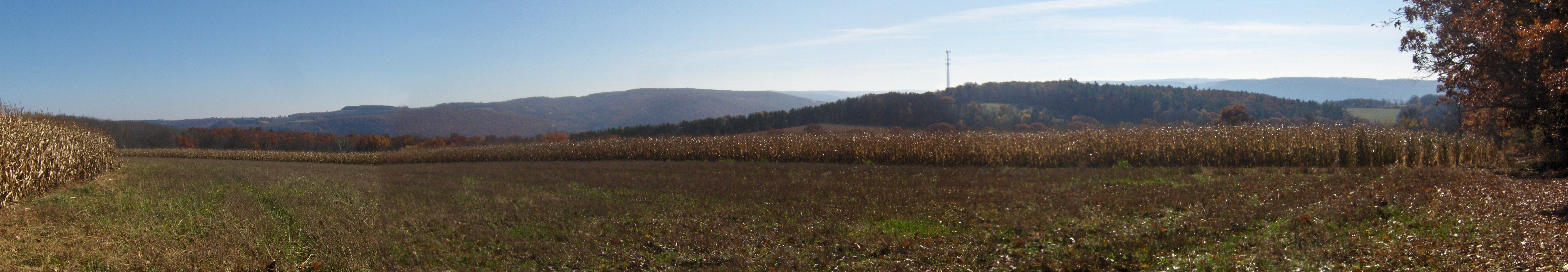 The trail ascends up Kershener Hill as you leave dirt Sand Pit Road behind you. There are views almost immediately as you ascend. Better views to follow as you walk along the edge of a cornfield after 0.65 miles of hiking (see panorama below). You'll pass a small pond on your right and then come to an opening at 1.55 miles, which is a trail that leads steeply 0.7 miles to Hickory Hill Campground.