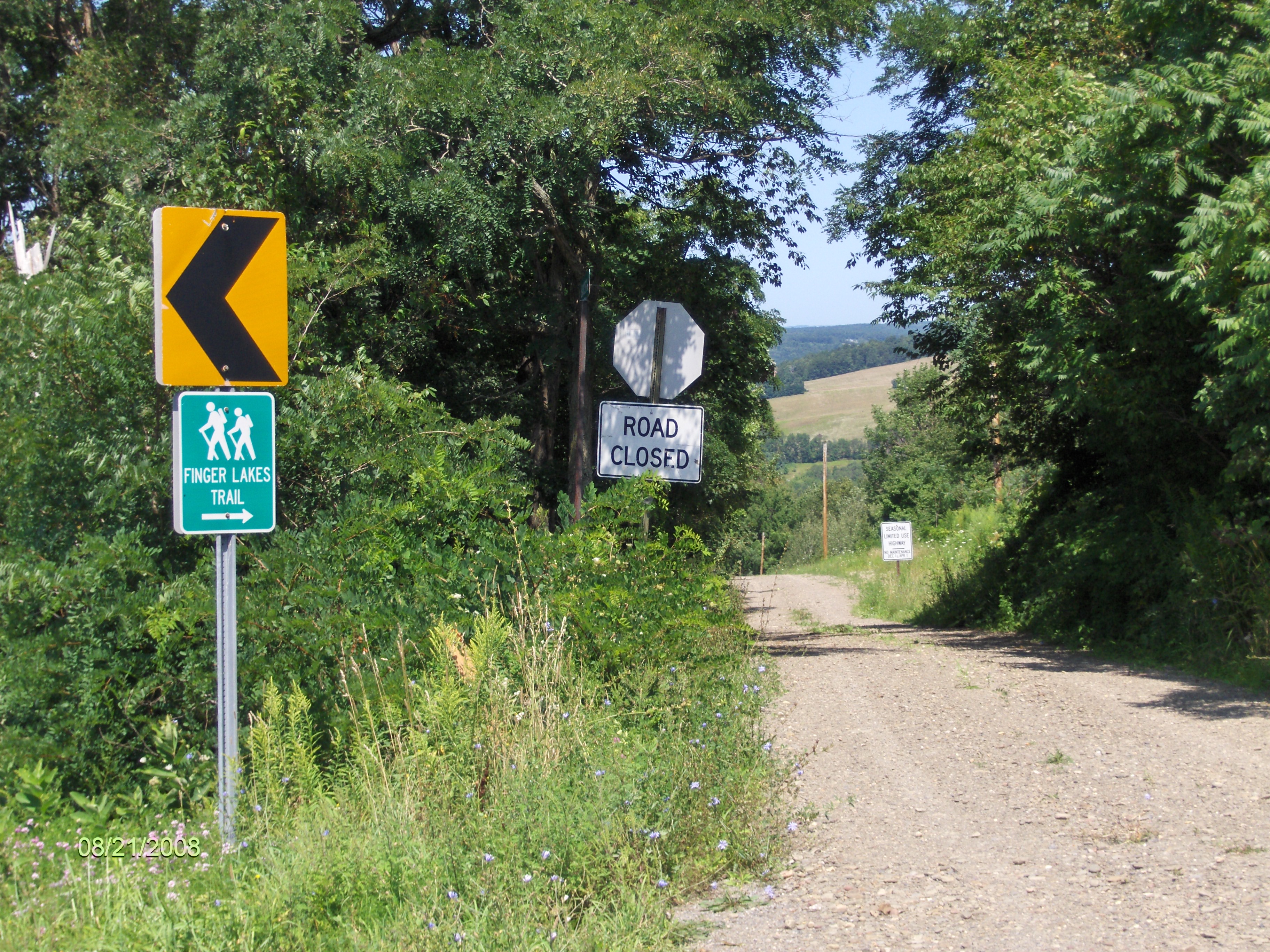 The trail turns right on NY 226 then in 0.2 miles turns left off the busy highway after the bridge and reenters the woods. The trail passes Sutryk Road and leaves the state forest. You are now hiking on private property. In just under a mile the trail reaches old Bozak Road and follows the road uphill. The trail reaches County Route 18 and follows the road. Check out the view first on your right as you reach the road and then to your left as you follow the road. Now turn right on County Route 17 and then a quick left on Moss Hill Road at the Finger Lakes Trail sign. This is the end of this section. You are in the small hamlet of South Bradford.