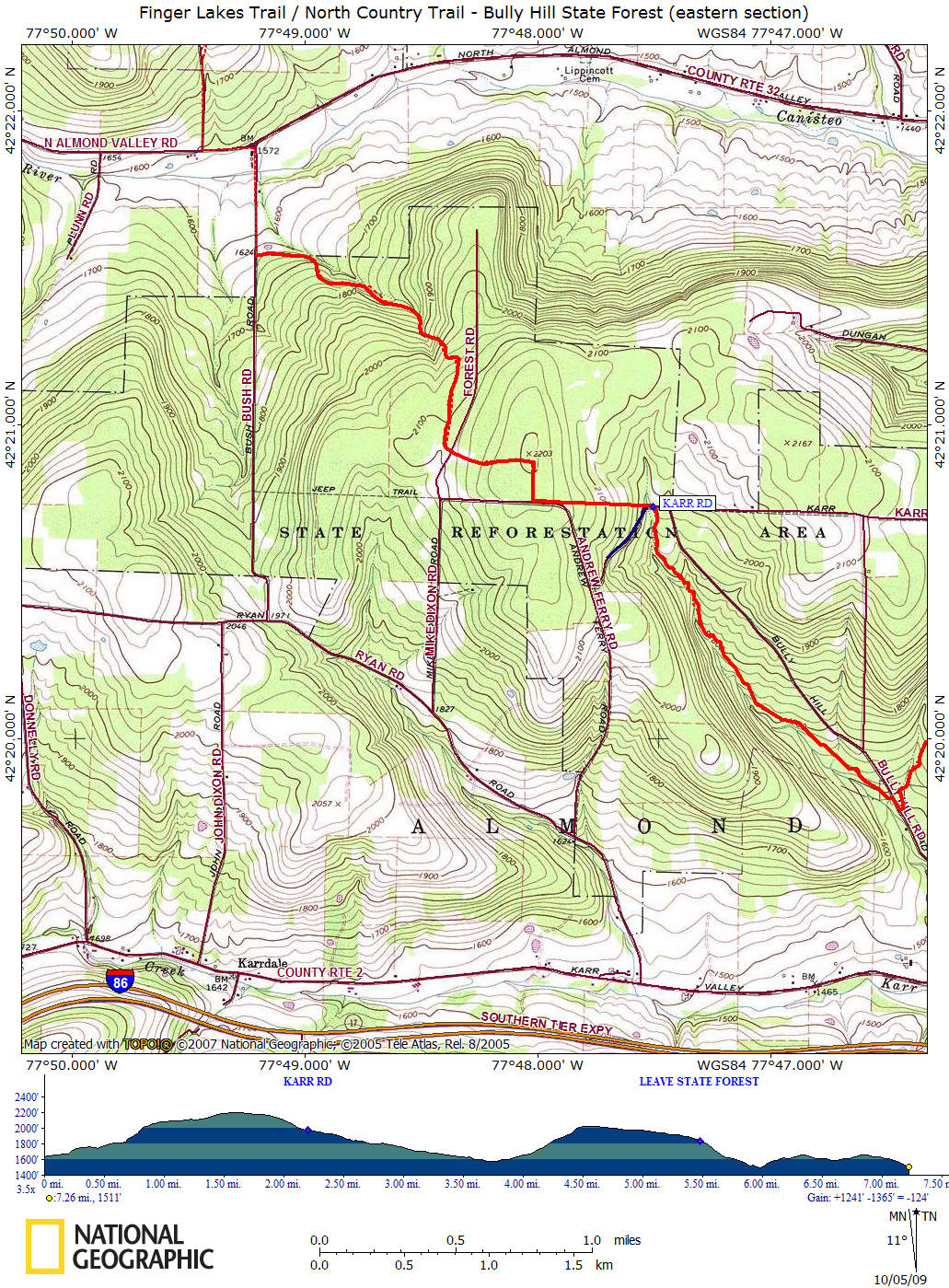 Mile Elevation North Country Trail Description (Follow white blazes) 0.0 1635 feet This section starts as the trail leaves Bush Road near seasonal road sign. Enter Bully Hill State Forest. Parking. GPS N42 21.538 W77 49.207