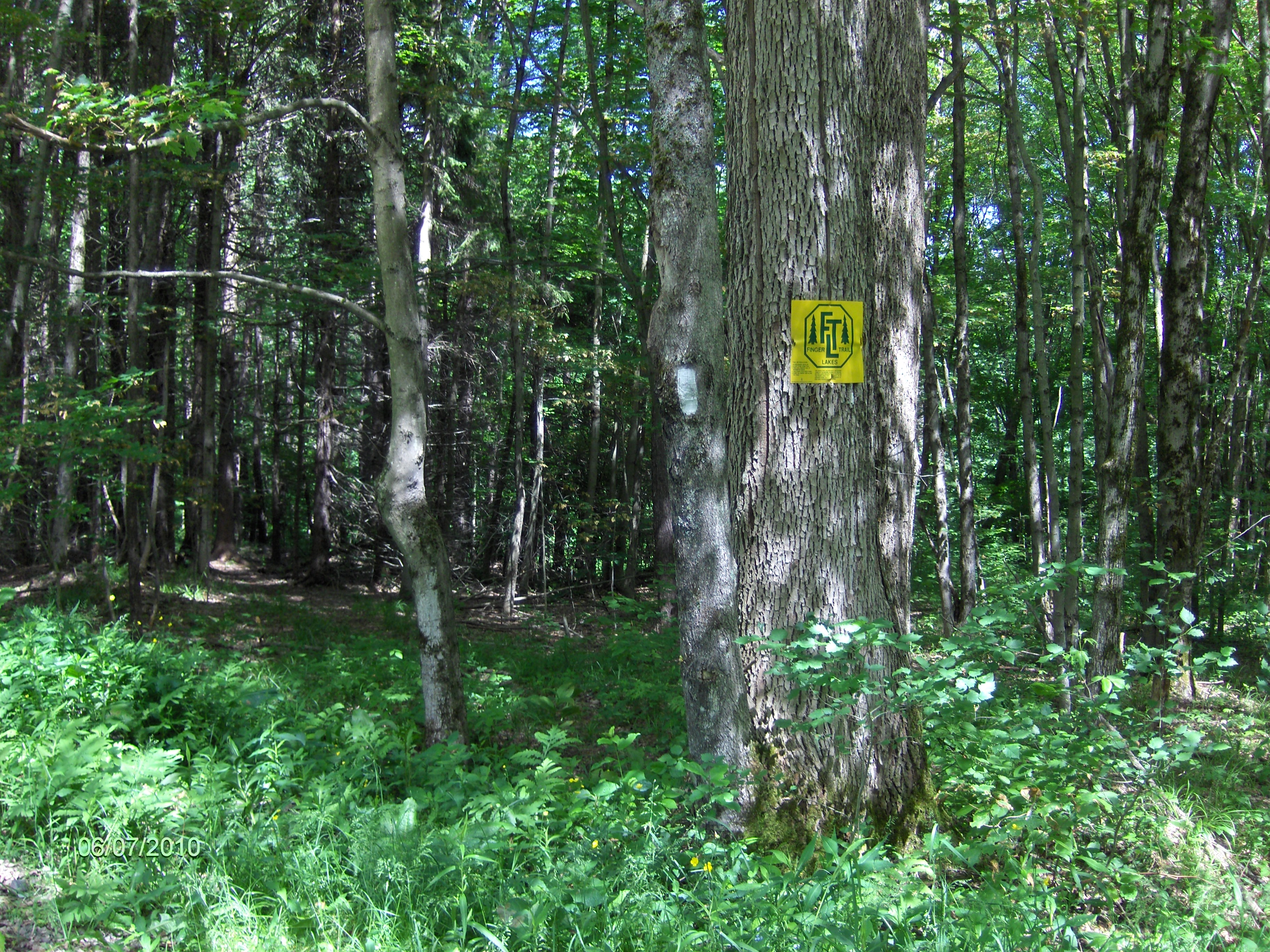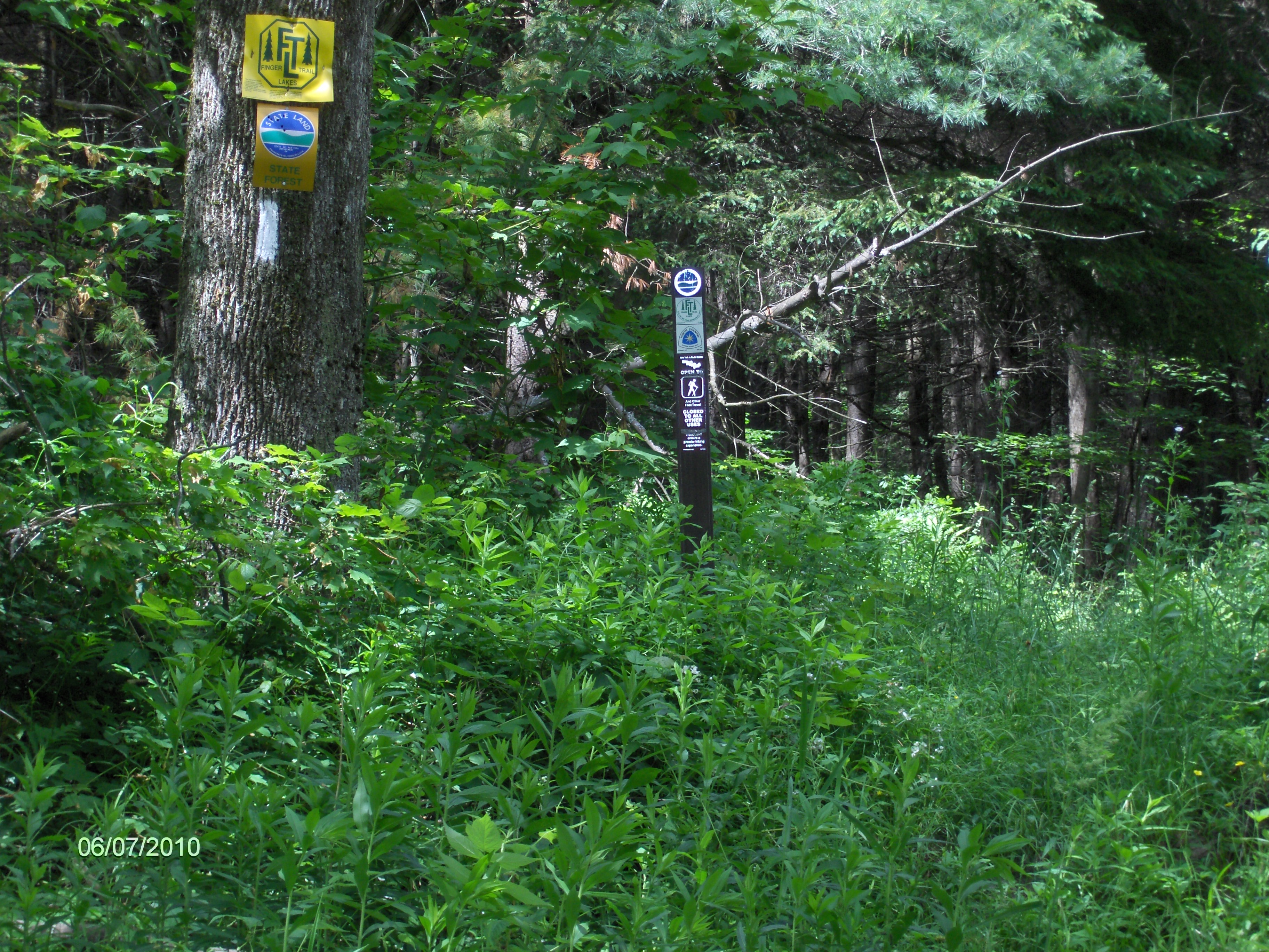 6.9 1969 feet Three Trails Junction. Trail Register. NCT/FLT split, trail turns left and begin to follow blue blazes. The orange blazed Chippewa Falls Trail goes straight. These are the FIRST blue blazes for the North Country Trail in NY.