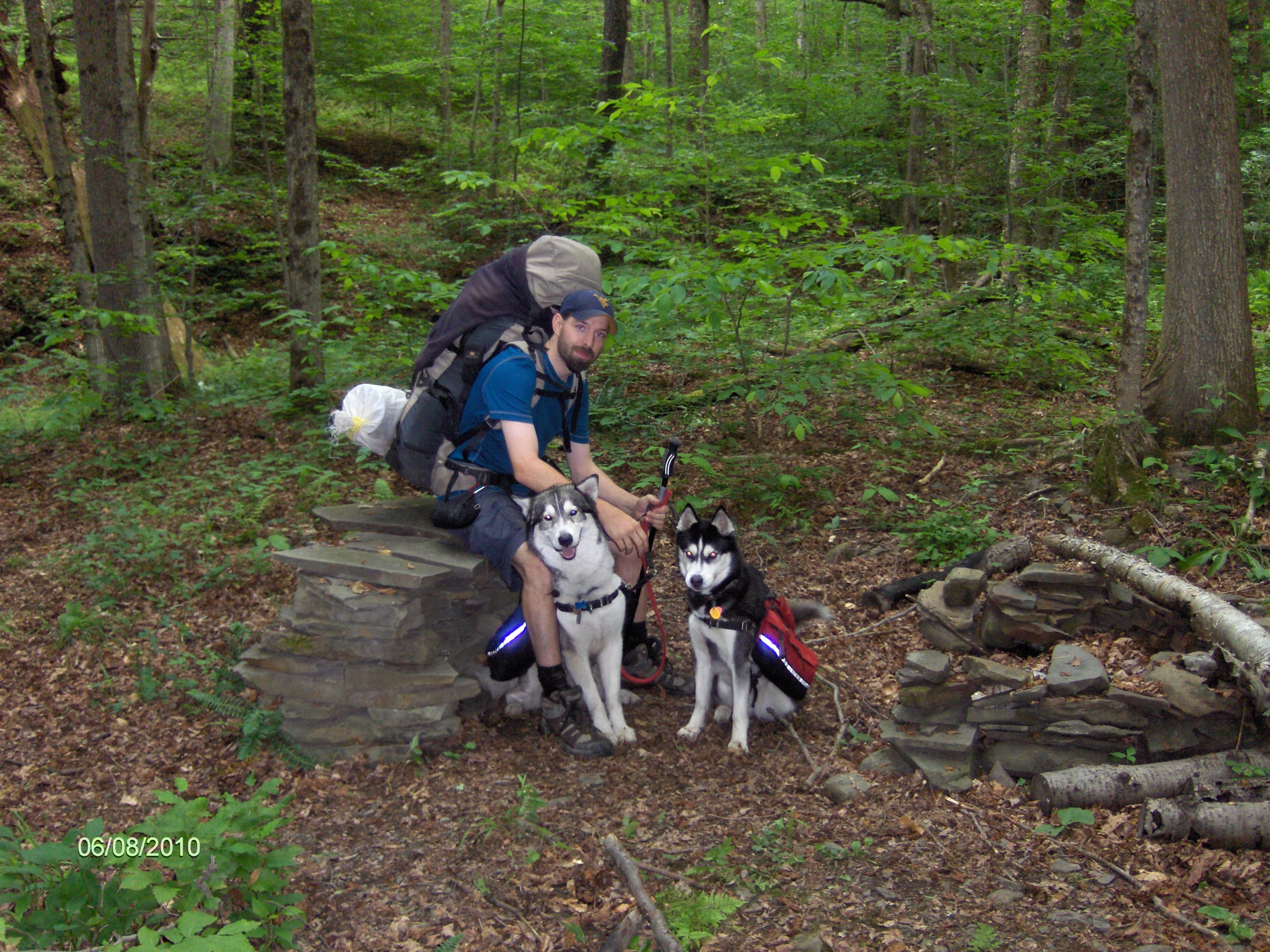 FLT thru hiker Kirk Doyle takes a break with his dogs Dakota & Scarlet at Wiltsey Glen