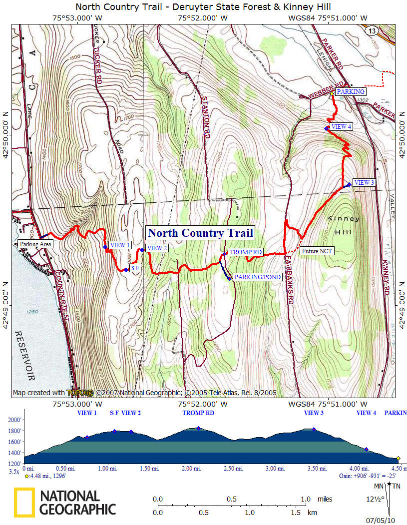 You may notice flags for a future relocation on private property expected to be open to hikers in the fall of 2010 to coincide with the "official" opening of the 0.5 mile section in Deruyter State Forest. For now continue to follow the current path and blue blazes.
