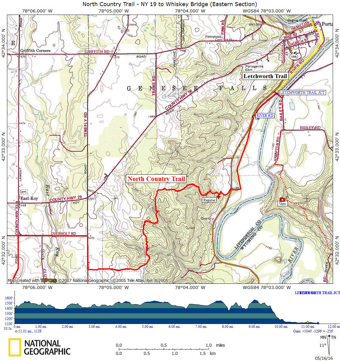 Mile Elevation North Country Trail Description (Follow white blazes) 0.0 1357 feet The sections begins where the trail leaves NY 19 just north of County Route 3 aka Buffalo Road. Limited shoulder parking. GPS N42 29.080 W78 08.648 NOTE: Trail from here to Rice Road is CLOSED for HUNTING from Oct 1 to Dec 22.