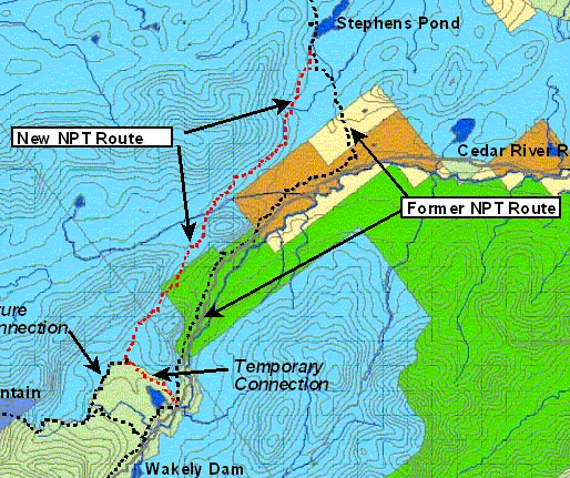 A long walk along dirt Cedar River Road which included passing by the very popular Wakely Dam Recreational Area was shortened in August 2009 with the opening of the first phase of a trail relocation that took the trail off private property and a dangerous beaver area. A future trail relocation will eliminate more of this road walk.