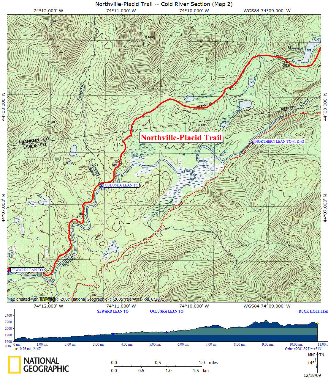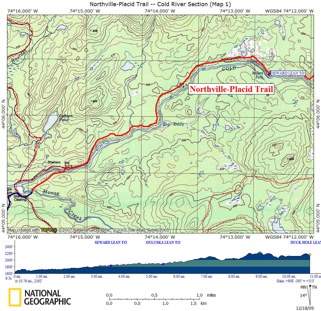 This section starts at Shattuck Clearing as the Northville Placid Trail crosses Moose Creek on a suspension footbridge. The trail crosses the Cold River on another suspension footbridge at 0.5 miles. There are two lean to shelters in this area. The trail now runs along the north bank of the Cold River. At 1.75 miles reach "Big Eddy" of the Cold River.