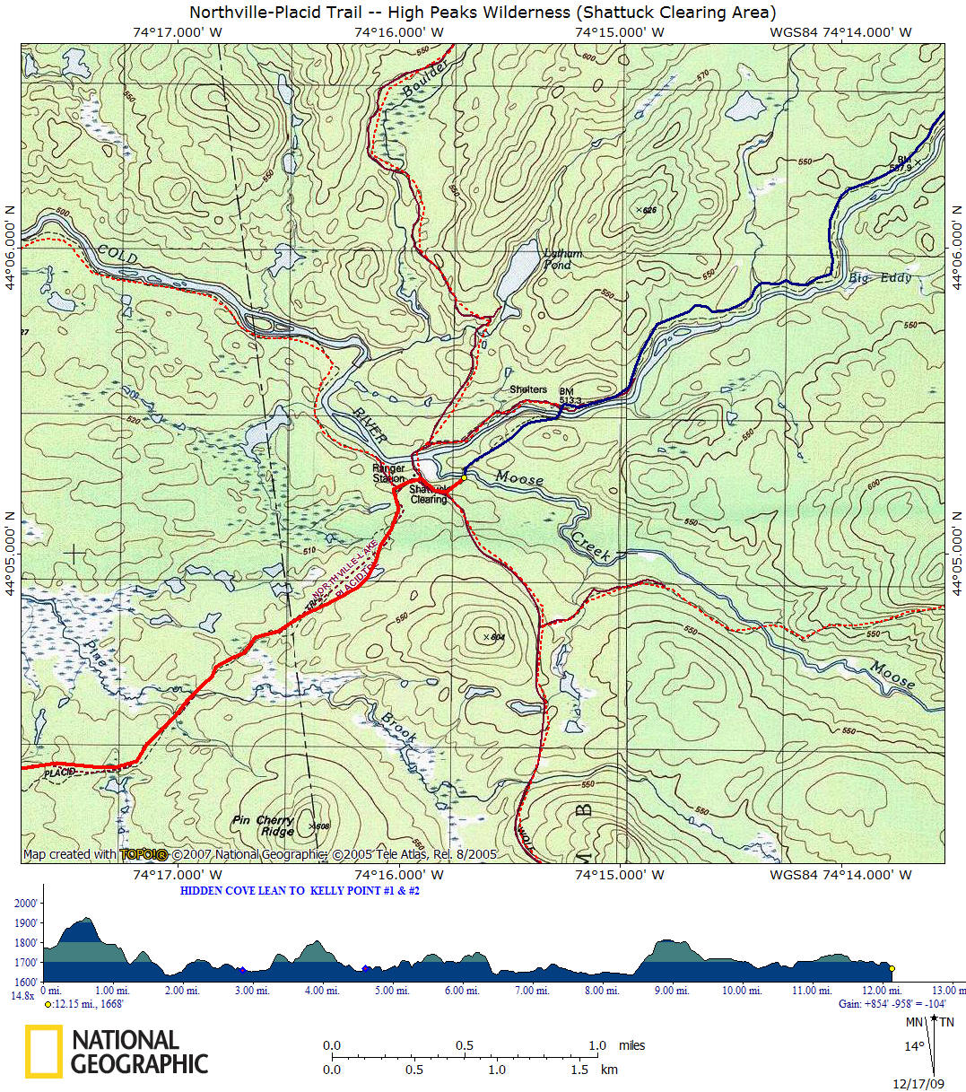 12.15 1668 ft Reach the suspension bridge over Moose Creek. End of this section. See Duck Hole for a continuation.
