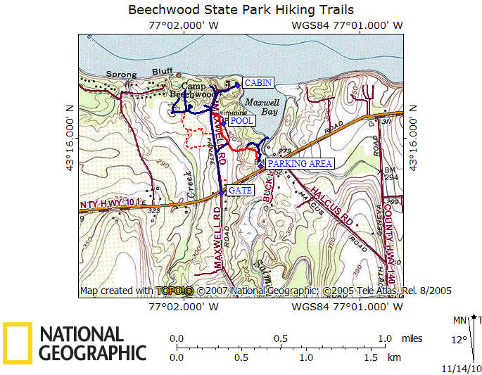Directions: From Baldwinsville, take NY 370 WEST to NY 104 WEST, drive past the NY 14 junction. Turn right on Geneva Road, then at stop sign, jog left/straight continuing on Geneva Road. Veer left on Halcus Road and then turn left on Lake Road. Cross the bridge for Maxwell Creek and turn right into gravel road that leads into a large gravel parking area. There are no signs for the park. The GPS coordinates for the parking area is N43 15.876 W77 01.571 for those who have a GPS devise for their vehicle.