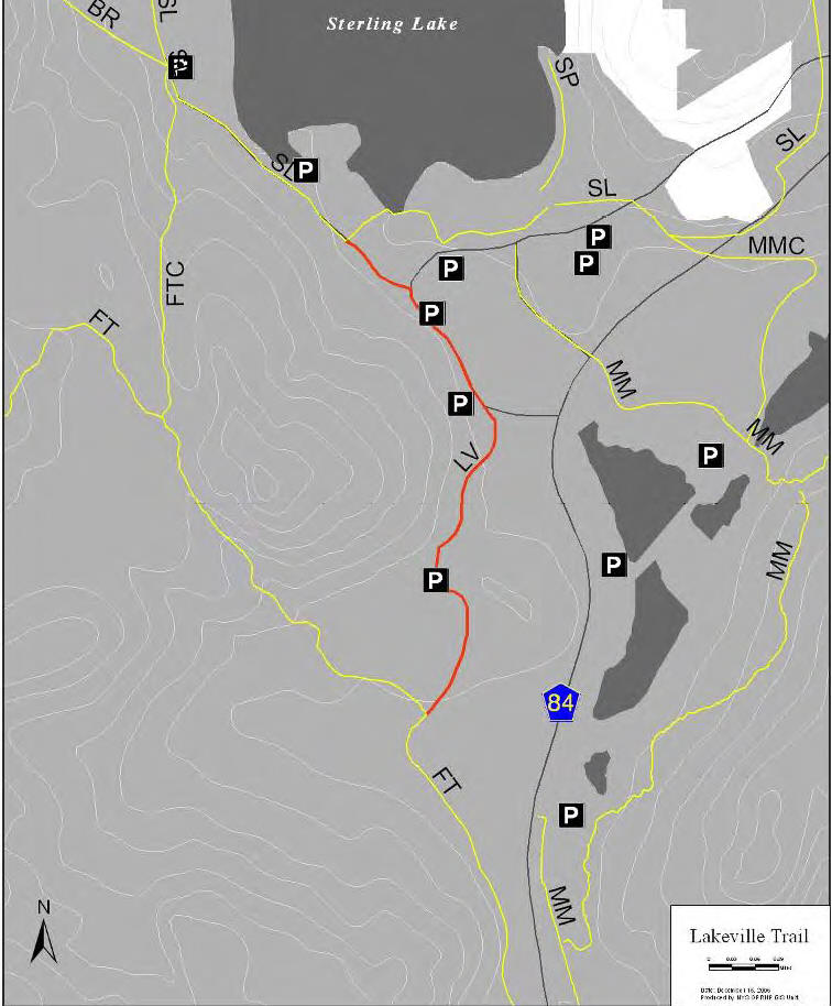 Lakeville Trail (0.8 miles) - The Lakeville Trail follows an abandoned paved roadway formerly known as the Sterling Lake Road. This trail is gated on its north intersection with Old Forge Road to prevent public vehicular access. This trail serves as a multiple use connection between the Visitor Center and the McKeags Meadow Trail.