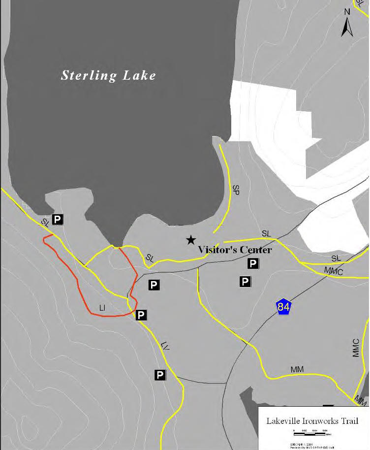 Lakeville Ironworks Trail (0.5 miles) - From the Visitor Center, patrons can walk south on the Sterling Lake Trail to the section that is on West Sterling Lake Road, where you will turn left onto the Lakeville Ironworks Trail. The trail goes up a small hill past the Lake Mine then takes a sharp left turn past the remains of the early 20th century iron ore processing structures – a cable house, crusher, dryer, ore separator, and storage bin.