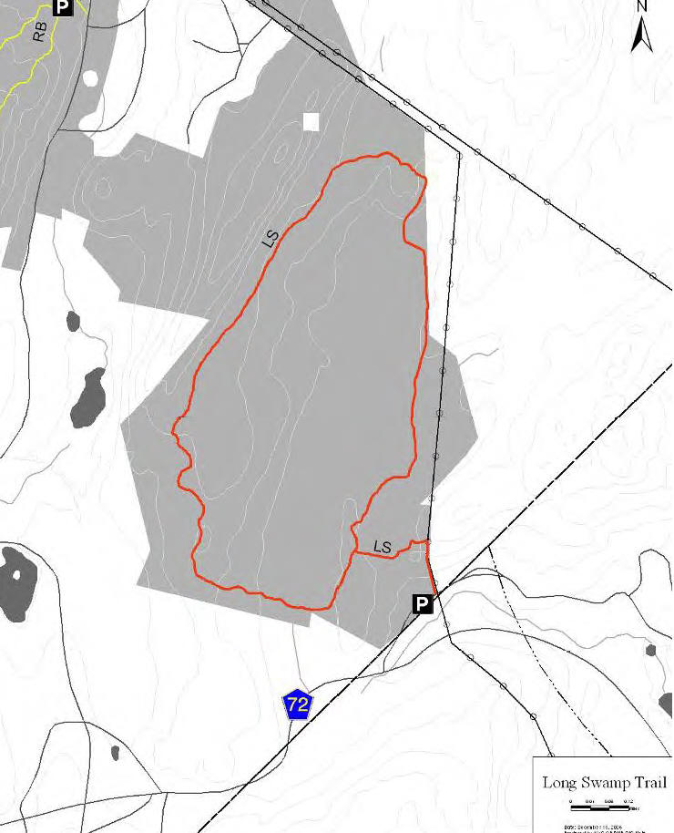 Long Swamp Trail (3.0 miles) - The trailhead and parking area for the Long Swamp Trail are located off of Eagle Valley Road. The loop is accessed by a short trail that follows along the shoulder of the road then travels up a power line right-of-way. The section along the shoulder of the road is very narrow and should be reroute off of the road, onto park land.
