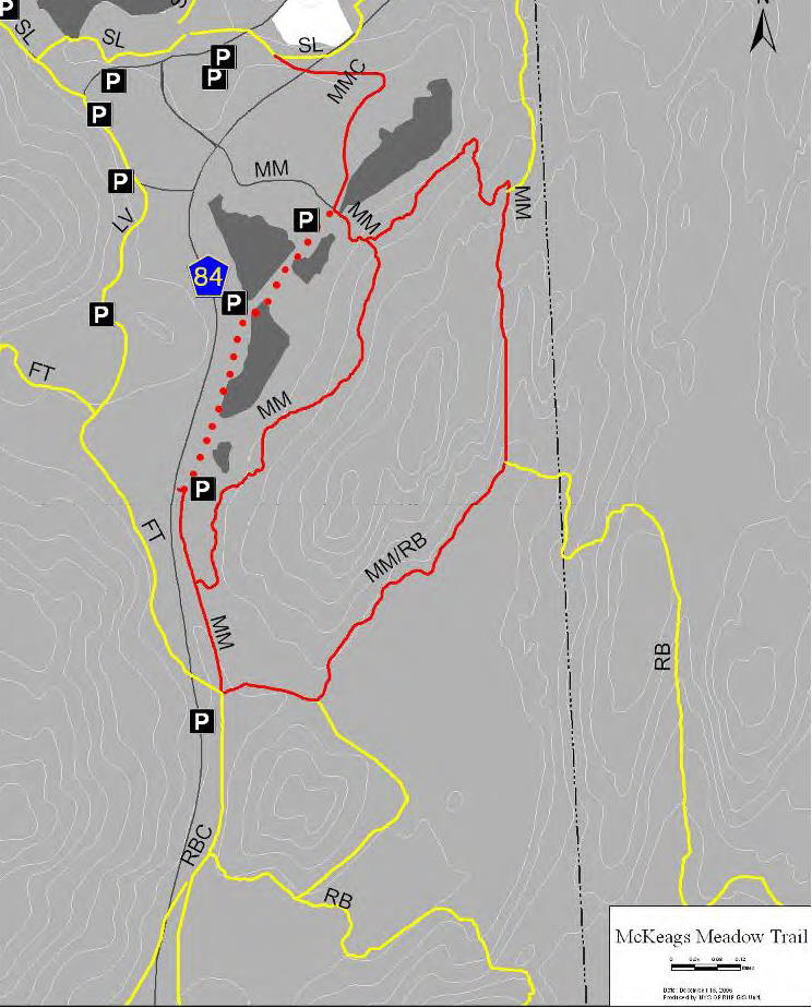 McKeags Meadow Trail (3.1 miles) - The trailhead is off of Long Meadow Road (Rt. 84) where there is a parking area with a portable toilet. The trail climbs gradually over wet and eroded spots. Traveling clockwise, at 0.6 miles, the trail surface levels off and passes by McKeags Meadow before descending past the intersection with the Red Back Trail.