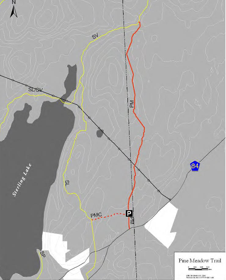 Pine Meadow Trail (1.4 miles) - The trailhead is located along Old Forge Road aka County Route 84, just east of the Sterling Forest State Park Visitor Center. There is a small year round parking area available at the trailhead. Generally the trail travels through hemlock. Two mine pits are found near the trail; one has water flowing into a two foot opening. The trail terminates at the Sterling Valley Trail, just north of Sterling Lake. Hikers may encounter wet sections on parts of the trail.
