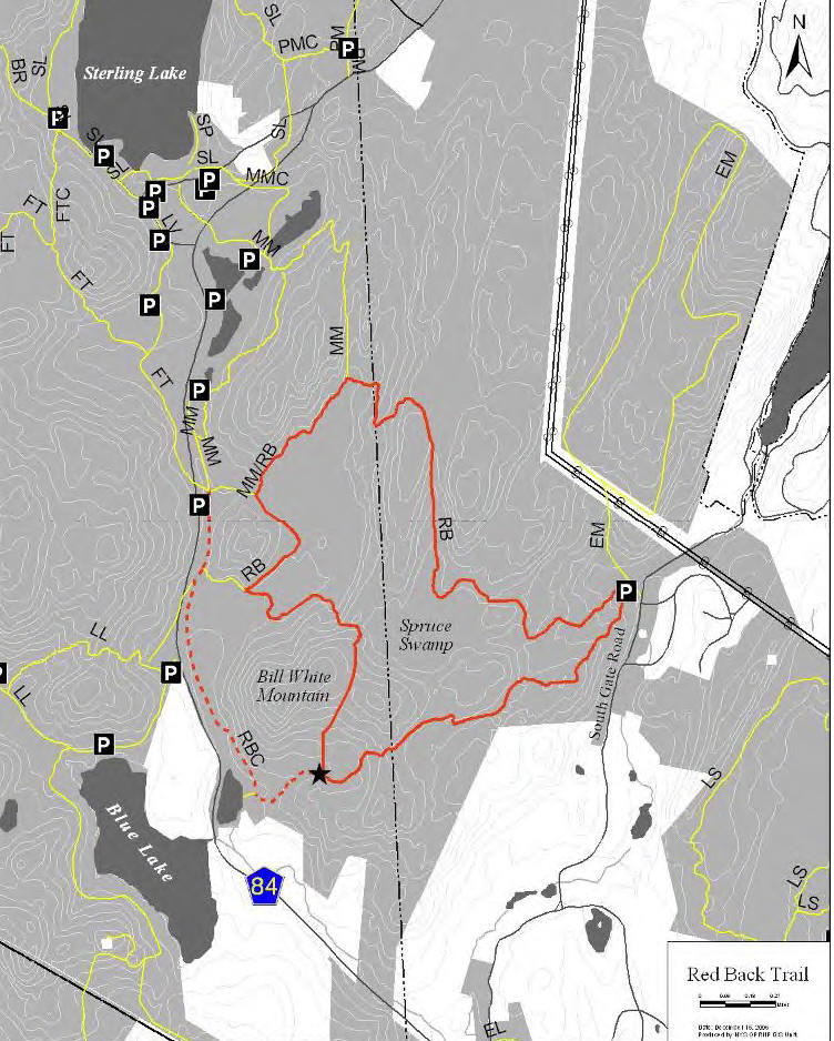 Red Back Trail (6.7 miles) - There is a parking area on South Gate Road. The trail assessment began at this point and was conducted in a clockwise direction. The trail ascends a series of low hills in a southwesterly direction until gently descending the south side of Bill White Mountain. At this point turn north and go over Bill White Mountain and down its north face which has a somewhat rocky path. Upon reaching the bottom of the hill, the trail goes westerly along a section where the trail travels through a major active beaver area.