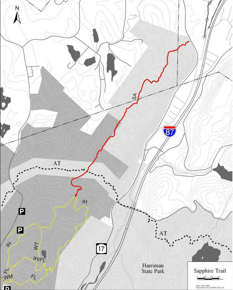 Sapphire Trail (2.6 miles) - This trail provides a connection between NY 17/Harriman Train Station and the Appalachian/Indian Hill trails. Beginning at NY 17 opposite the train station, the trail is in Harriman State Park and doesn't enter into Sterling Forest State Park until 1.8 miles. The trail leaves NY 17, passes a park access gate and continues across a roadway (the former highway) and enters a mixed pine/hardwood forest.